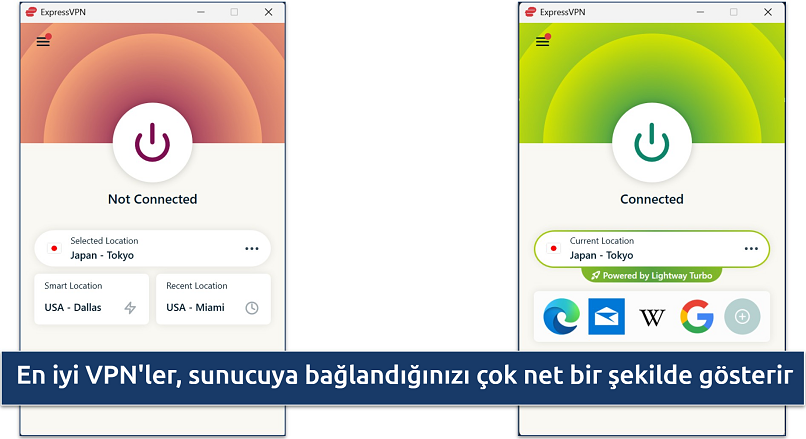 Artık IP adresinizi değiştirmek ve gerçek adresinizi gizlemek için sunucuya bağlanabilirsiniz. İyi bir VPN, yüklenir yüklenmez en üst düzeyde güvenlik sağlamak üzere yapılandırılmış olarak gelir ancak VPN’ye bağlanmadan önce ayarlara göz atmak isteyebilirsiniz. VPN'ler genellikle farklı protokollerle VPN’ye bağlanmanıza izin verir veya açıp kapatabileceğiniz durdurma anahtarı gibi özellikler sunar; bu özellik, beklenmedik bir şekilde VPN’nin bağlantısının düşmesi durumunda internet bağlantınızı keser. Bu özelliği ayarladıktan sonra VPN’ye bağlanabilirsiniz. Örneğin, VPN aracılığıyla Japonya’dan edineceğiniz bir IP adresi ile Rakuten bankacılık uygulamasına her yerden güvenle erişebilirsiniz.