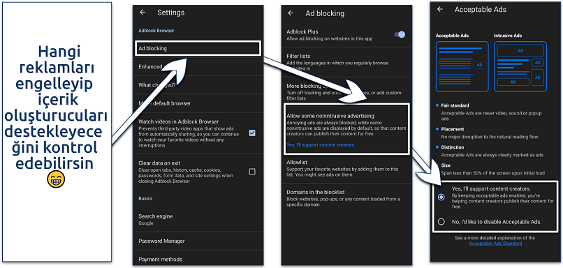 Adblock Tarayıcı, tercihlere göre uygulanabilecek çeşitli ayarlar sunar. Bu esneklik, reklamların nasıl ve ne zaman gösterildiğine dair kişisel reklam engelleme stratejilerini uyarlayabilmeyi sağlar, bu da onu reklam engelleme konusunda tercihleri kişiselleştirmek için çok yönlü bir araç haline getirir. Örneğin, bazı hoşgörülür reklamları desteklemesi, içerik oluşturuculara yardımcı olurken reklam engelleme ve ücretsiz çevrim içi içerik desteği arasında bir denge oluşturur.