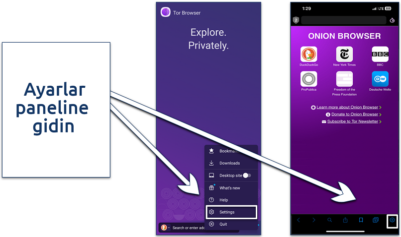 1. Adım: Cihazınızda Tor Tarayıcı uygulamasını veya Onion Tarayıcı uygulamasını başlatın. Üç nokta veya dişli simgesine dokunun ve Ayarlar (Settings) menüsüne girin.