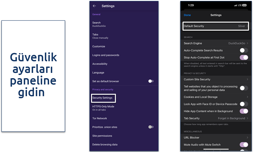 2. Adım: Tarayıcınıza bağlı olarak Güvenlik Ayarları ("Security Settings") veya Varsayılan Güvenlik ("Default Security") seçeneğine dokunun.
