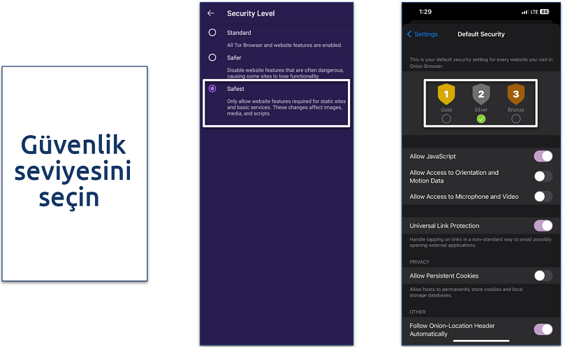 Benzer şekilde, Onion Tarayıcı da 3 güvenlik seviyesine sahiptir — Altın (Gold), Gümüş (Silver) ve Bronz (Bronze). Bronz (Bronze) seviyesi en düşük güvenliği sağlar, varsayılan olarak komut dosyalarına ve videolara, mikrofonunuza erişime izin verir. Gümüş (Silver) seviyesi mikrofonunuza ve diğer özelliklere erişimi kısıtlar ancak JavaScript'e izin verirken, Altın (Gold) seviyesi tüm erişimi ve komut dosyalarına erişimi ciddi şekilde sınırlar.