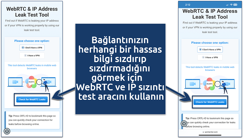 Her şeyi ayarladıktan sonra, kişisel bilgilerinizin gizli kalmasını sağlamak için atılması gereken son derece önemli bir adım daha var. IP adresiniz ve WebRTC dahil olmak üzere herhangi bir sızıntı olup olmadığını kontrol edin. Bu, dijital kalkanınızda çatlak olup olmadığını görmek için önemlidir.